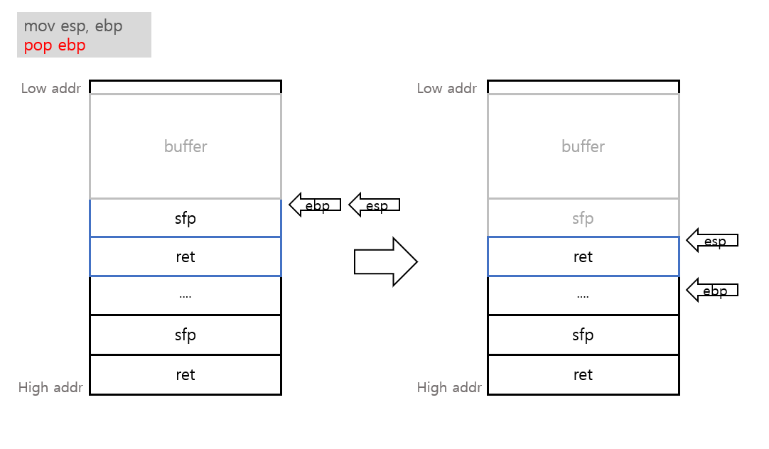 +) 혹시나 stack의 가장 위에는 buffer가 있으니 이 값이 pop되어야하는게 아니냐고 할 수도 있지만, stack의 가장 최상단은 esp가 정합니다. 따라서 stack의 가장 상단의 값은 sfp입니다.