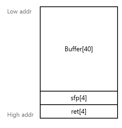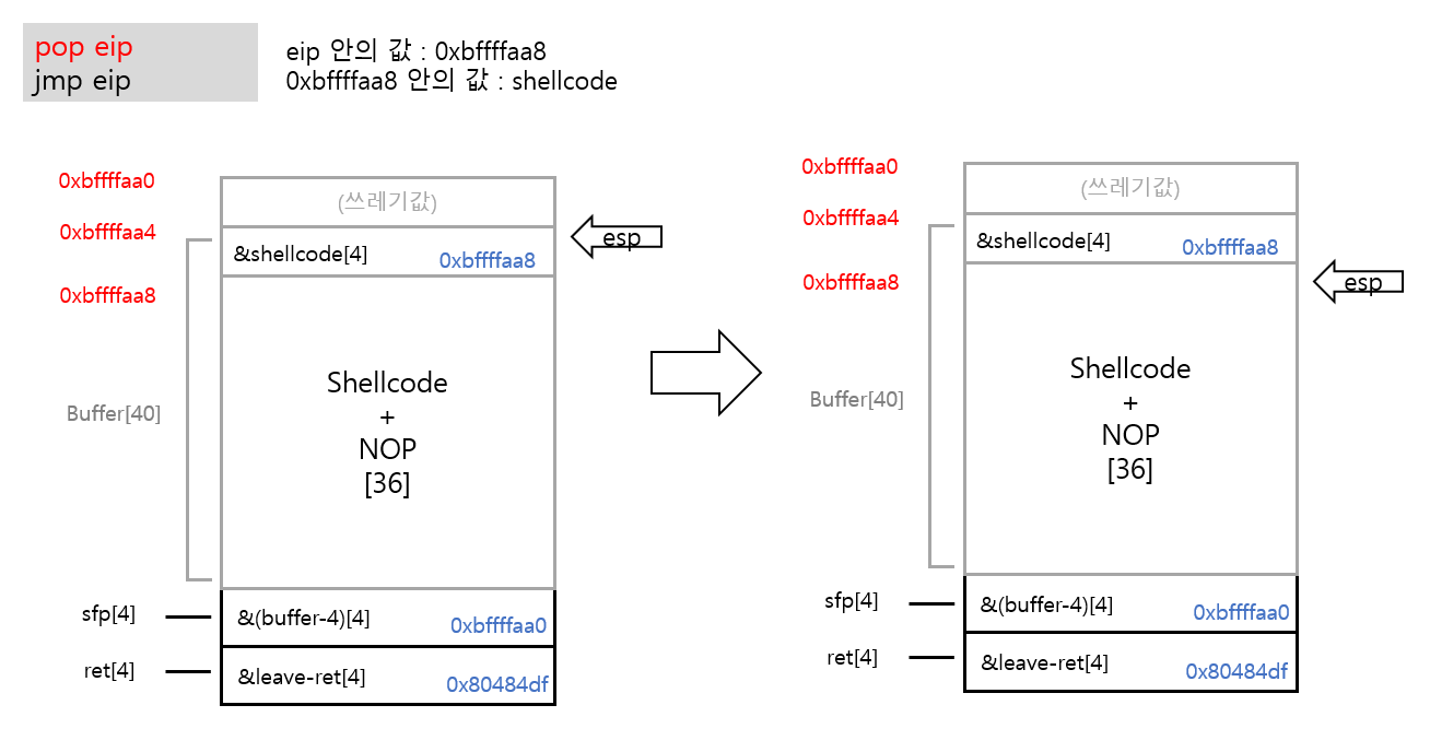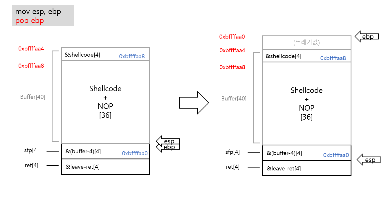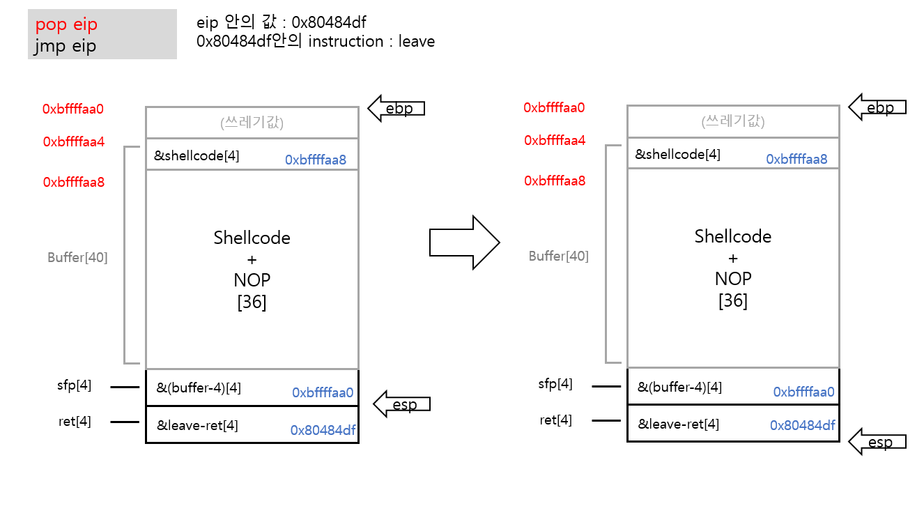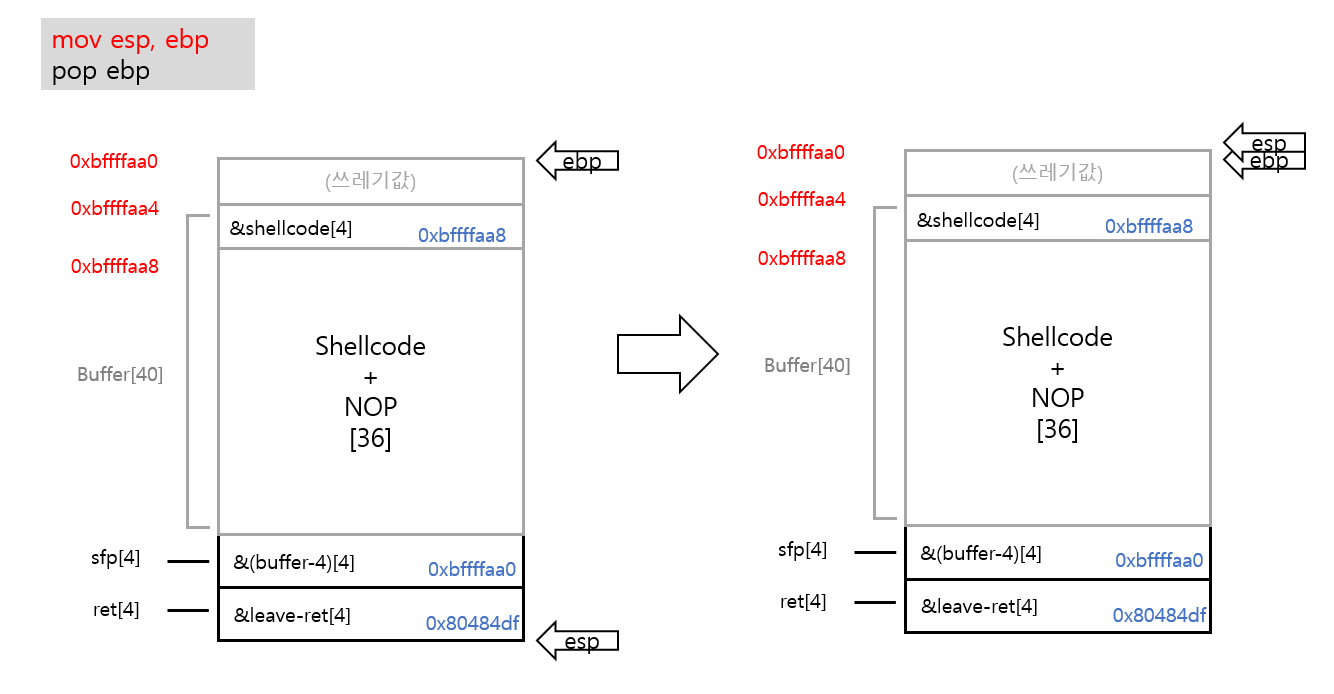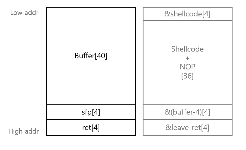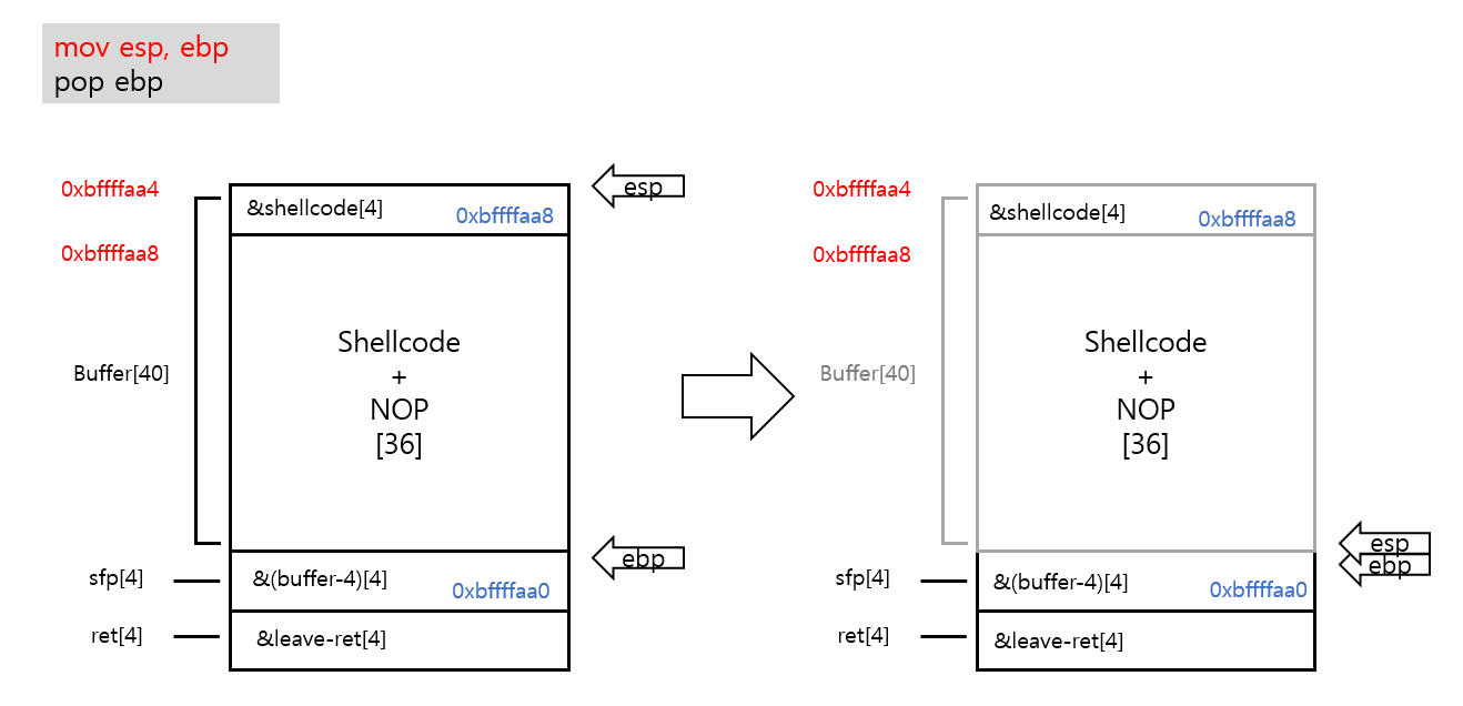 shellcode의 주소[4] + shellcode+NOP[36] + buffer-4의 주소[4] + leave-ret 가젯의 주소[4]