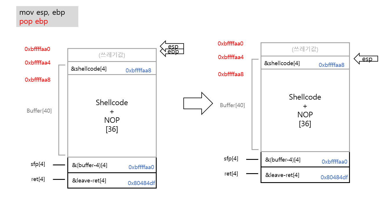 원래는 이전 함수에서의 ebp값으로 pop을 했겠지만, 우리가 0xbffffaa0이라는 buffer-4의 주소값으로 덮어주었기 때문에 ebp는 buffer-4의 주소를 가리키고 있고(매우중요!), esp는 pop했기 때문에 sfp밑에있는 ret를 가리키고 있게 됩니다. 실제로 쓰이지 않을것이기때문에 0xbffffaa0에는 쓰레기값이 있다고 써놓았지만, 굳이 따지고 실제로 확인해본다면 buffer의 주소(0xbffffaa4)가 들어가있을겁니다. 아무튼 이건 중요하지 않으니 pass