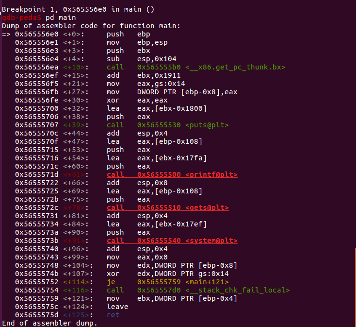 다음은 단순히 main함수의 시작에 breakpoint를 걸어두고 실행 뒤 main함수를 다시 확인한 결과입니다. 바뀐 것을 확인할 수 있죠? 조금 더 원리에 기반해서 설명을 하자면, code영역의 시작이 0x56555000로 잡힌것입니다! 이건 어떻게 아냐구요?