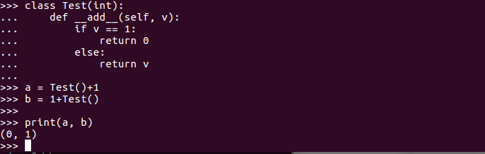 반면에, 1 + Test()의 경우에는 Test를 부르고 그 뒤에 따로 인자가 없기 때문에 __add__가 애초에 호출되지 않습니다. 따라서 값은 1이 리턴이 되며, 두 값을 다르므로 if문을 건너뜁니다.