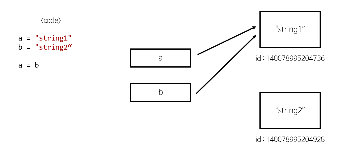 보면 다른 값이 할당되어있던 a와 b는 각각 다른 레퍼런스 값을 가지고 있었지만, b에 a의 값을 넣어준 뒤로는 레퍼런스의 값이 같아진 것을 볼 수 있습니다.