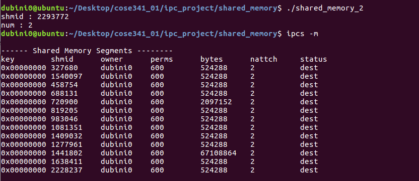 그리고 IPC_RMID의 경우에는 제거하도록 하는 커맨드입니다. 그러면 이론상 실행시켰을 때 할당한 공유메모리를 삭제하겠죠? 프로그램 실행 후 공유메모리 현황을 봅시다.
