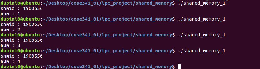 key는 코드상에서 아예 박아놓았기 때문에 shmid는 동일하고, 공유메모리이기때문에 num자체는 증가하는걸 볼 수 있습니다.