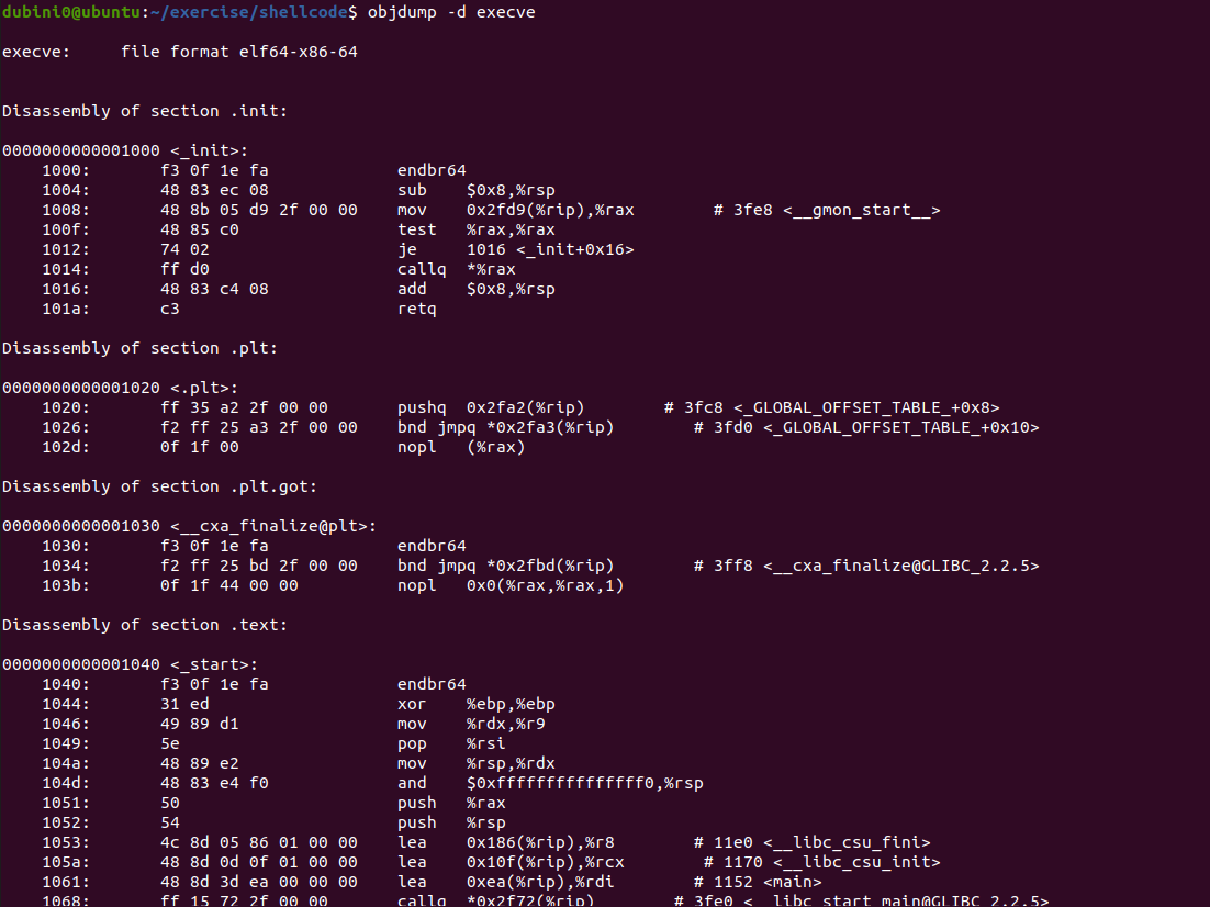 objdump -d 파일명을 통해 덤프를 시킨 뒤 해당 코드 부분을 직접 모으면 바이트코드 형태의 쉘코드를 만들 수 있다. 다만 \x00이 포함되면 안된다거나 등등의 신경써줘야 할 부분들이 있다. 이건 나중에 기회가 되면 다른 글로 정리할 예정이다.